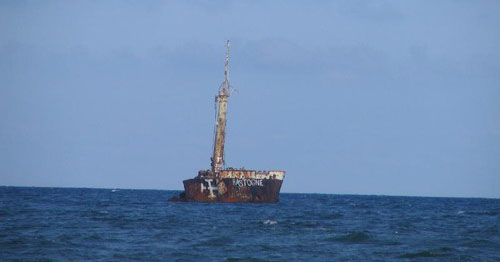 Nava sub pavilion Grecia plecase din Braila cu destinatie Alexandria, Egipt. In data de 19 februarie 1981 a fost surprinsa de furtuna si a esuat la cateva sute de metri de plaja de la Vama Veche. Echipajul a fost salvat, nava nefiind recuperata, iar incarcatura a fost scoasa la suprafata dupa 20 de ani. In prezent, deasupra apei este vizibila doar o mica parte din prova epavei. Sursa: Wikipedia, the free encyclopedia. |